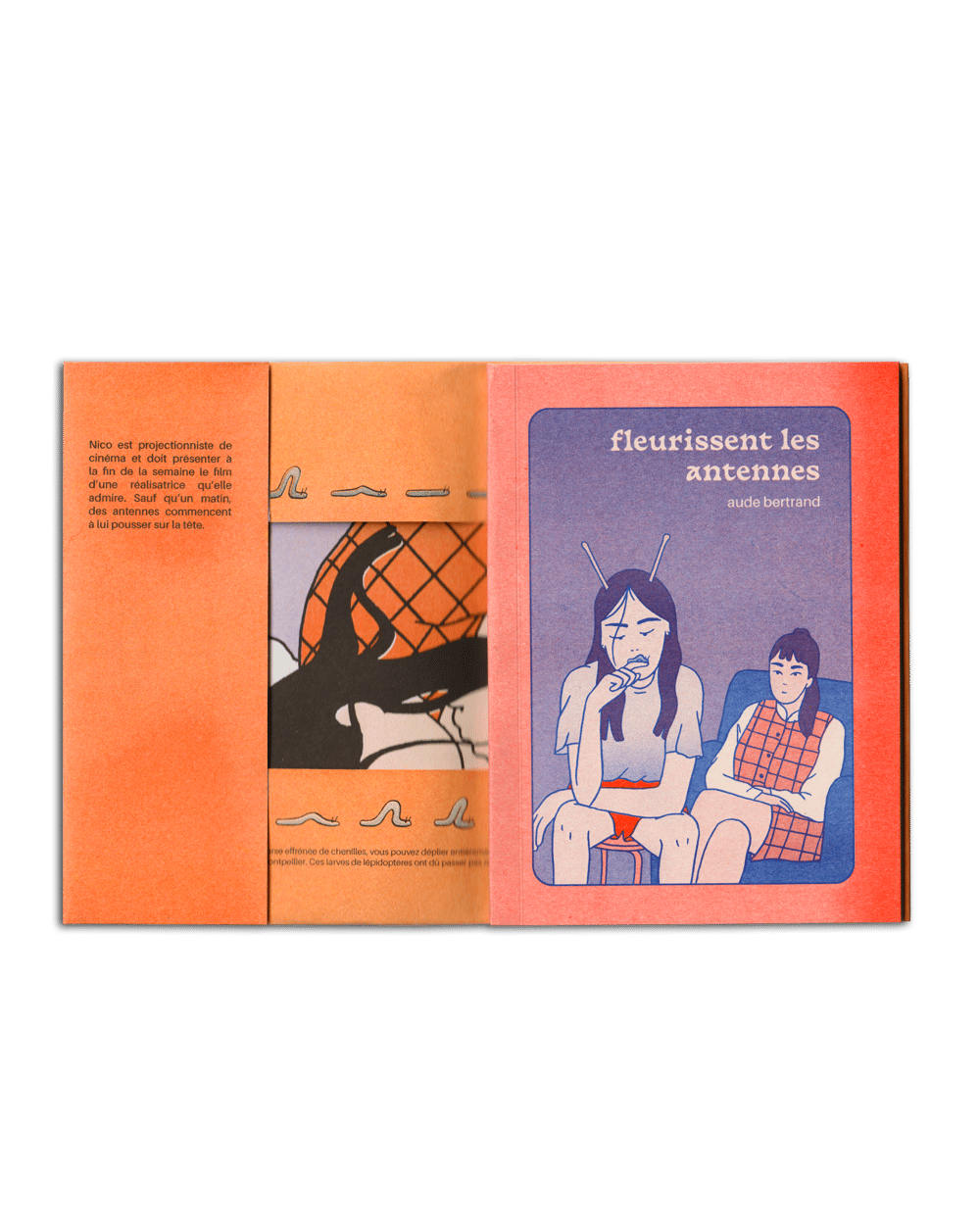 Ecrit et illustré par Aude Bertrand, Fleurissent les antennes a été imprimé en risographie chez Mad Series à Montpellier en 200 exemplaires au format 13x18 cm. La couverture est imprimée sur du papier Pop'Set Oyster 240g et les pages intérieures sur du Munken Lynx 120g. Relié et collé à la main.
